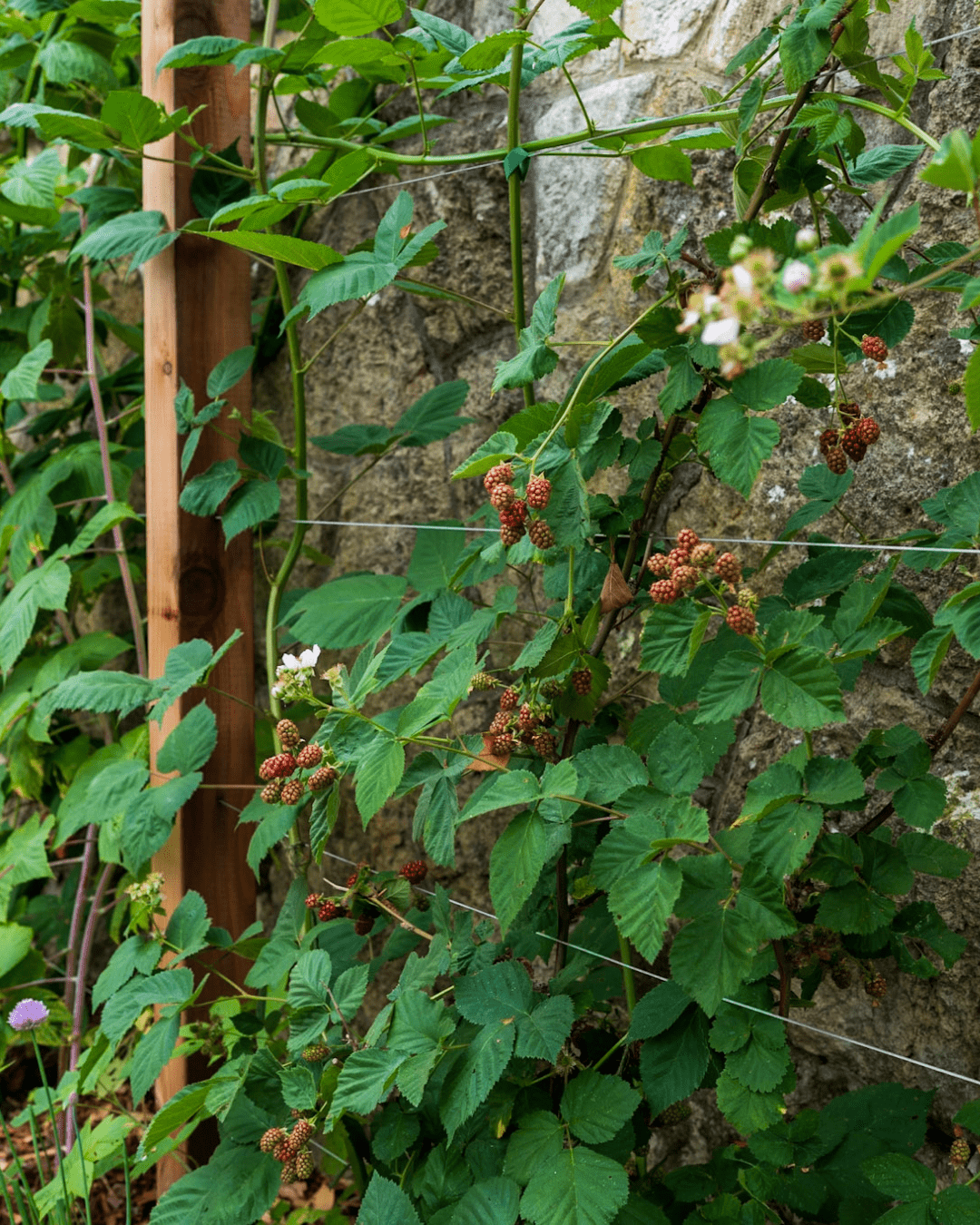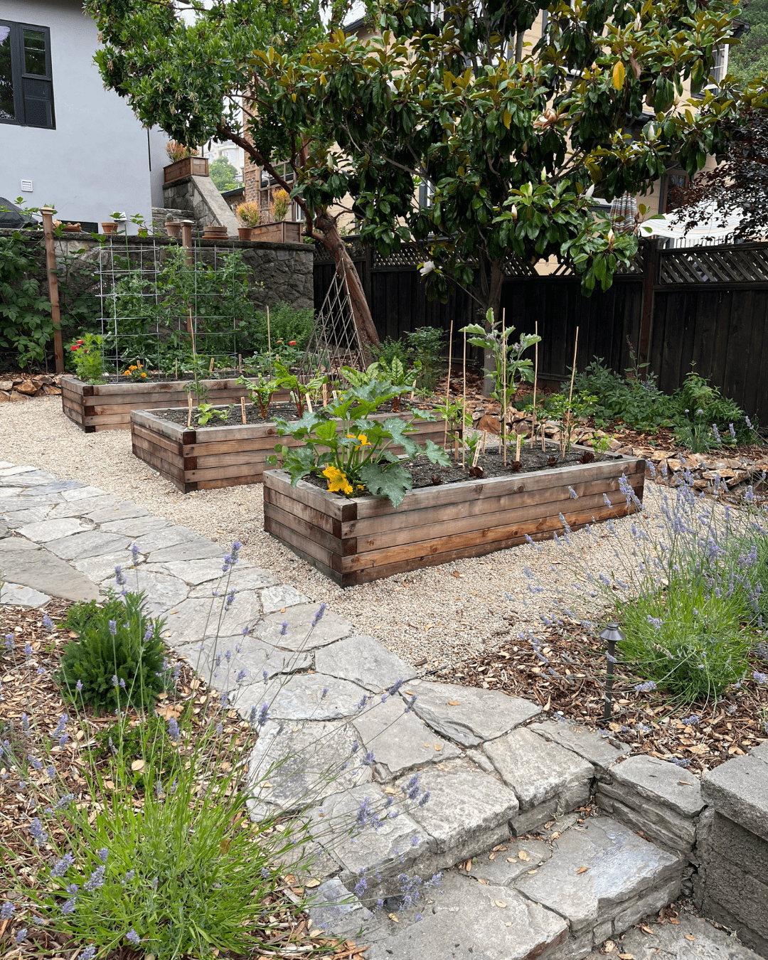 The backyard is now a lush, multi-use space where the homeowners can grow food, enjoy the cool summer climate, and observe the wildlife that moves through the garden. Berries form a beautiful and productive perimeter throughout the property, paired with fruit trees — apples, figs, and Santa Rosa plums — and raised beds that provide enough vegetable production for the family to harvest all year long.