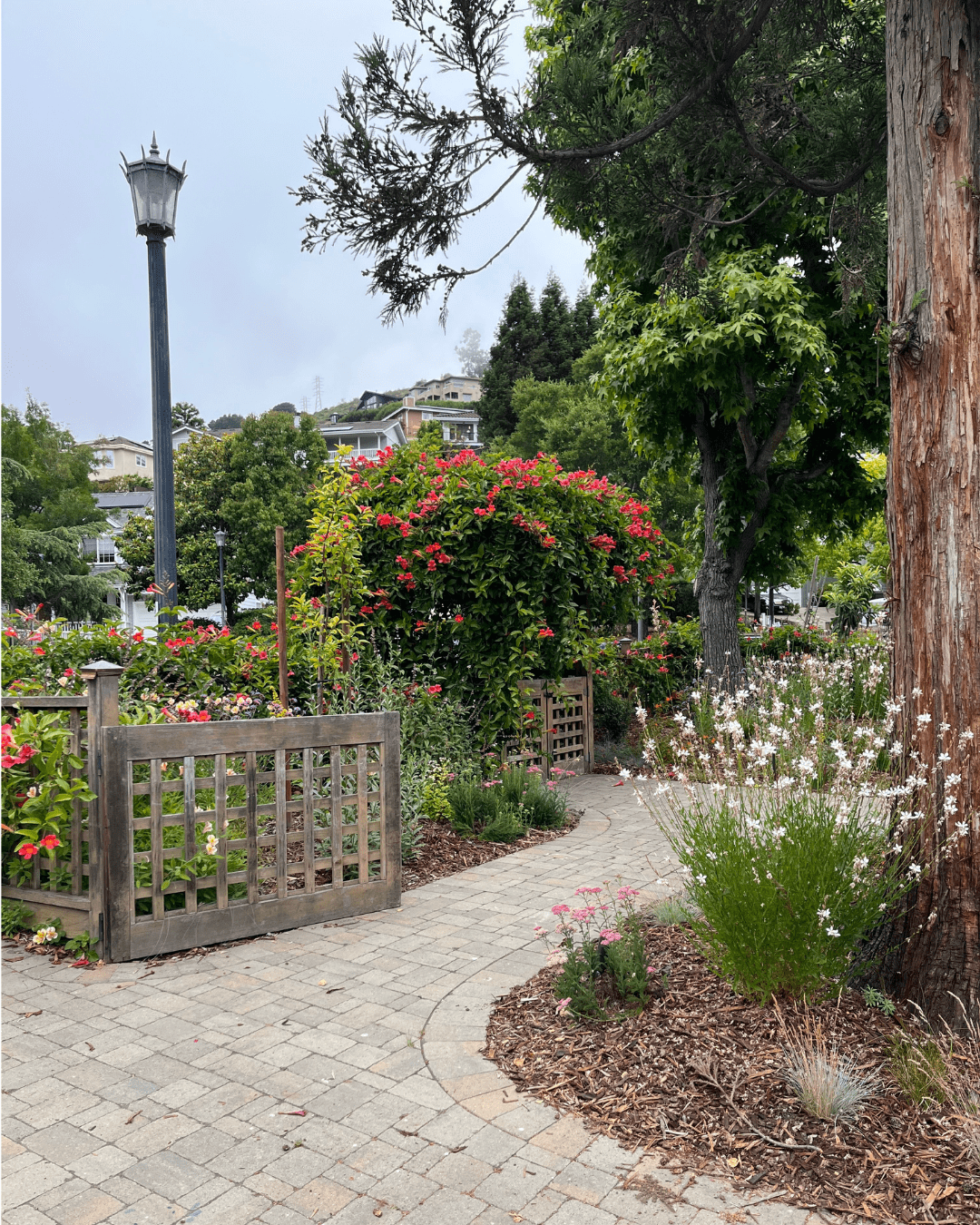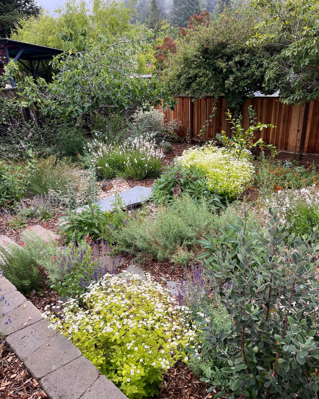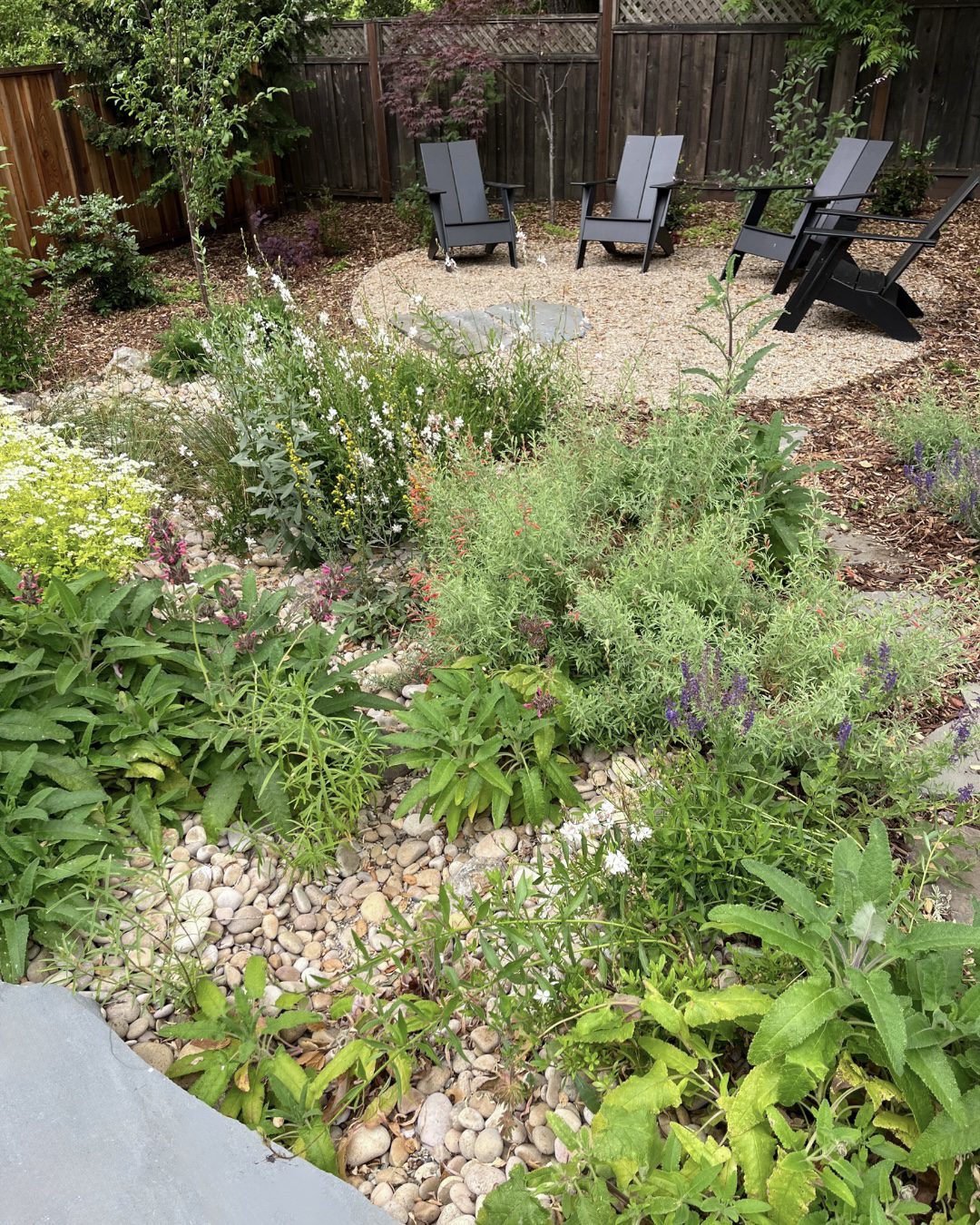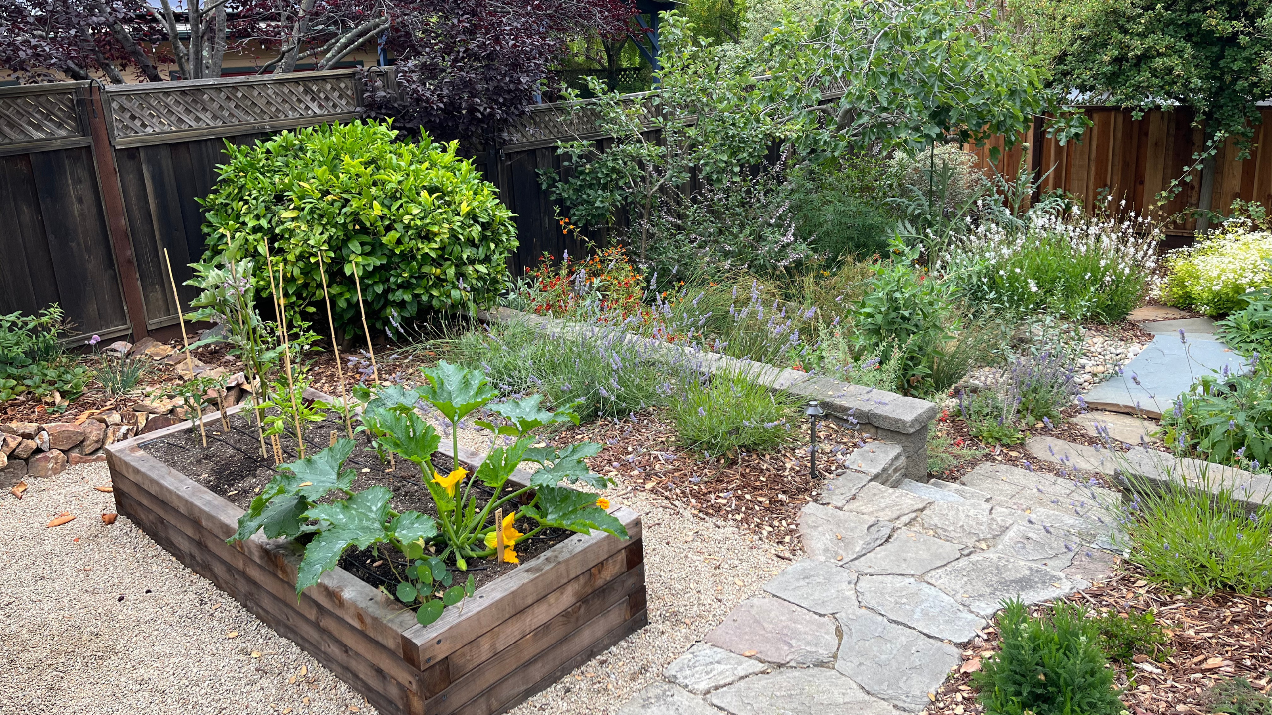 Overlooking the foggy slopes of the Oakland Hills, this project transformed an unused, half-dead lawn into a vibrant space for edible gardening, wildlife watching, and everyday outdoor living. Designed for a couple who wanted both beauty and productivity, the garden blends historic stonework with colorful, low-water plantings and a highly functional rain garden that brings new life to the property.