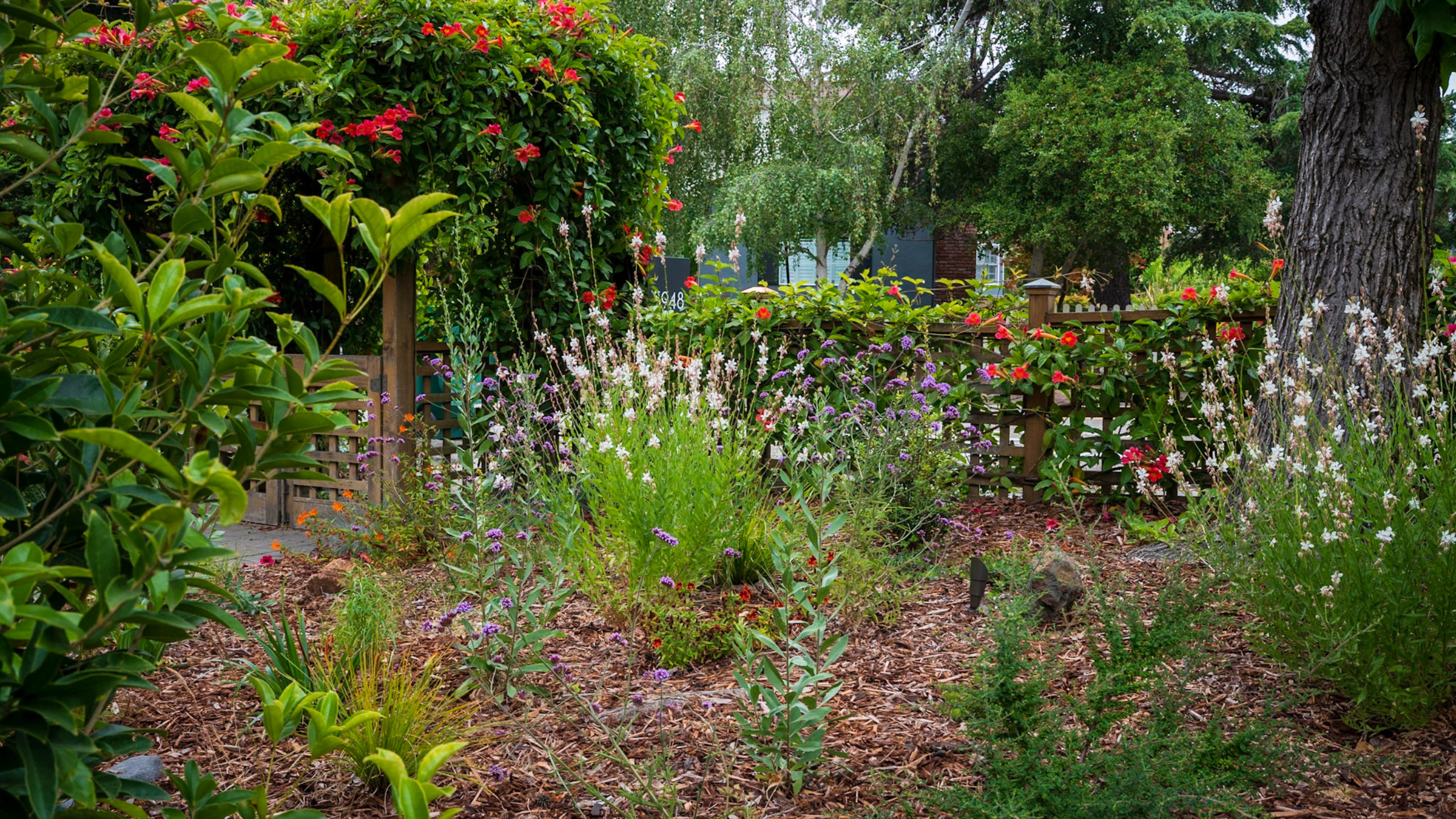 In the front yard, mature canopy trees made edible planting challenging, so Farmscape designed a native, low-water meadow composed of grasses and grass-like plants with subtle, seasonal flowers. The result is a calm, textural landscape that complements the home, conserves water, and supports local ecology.