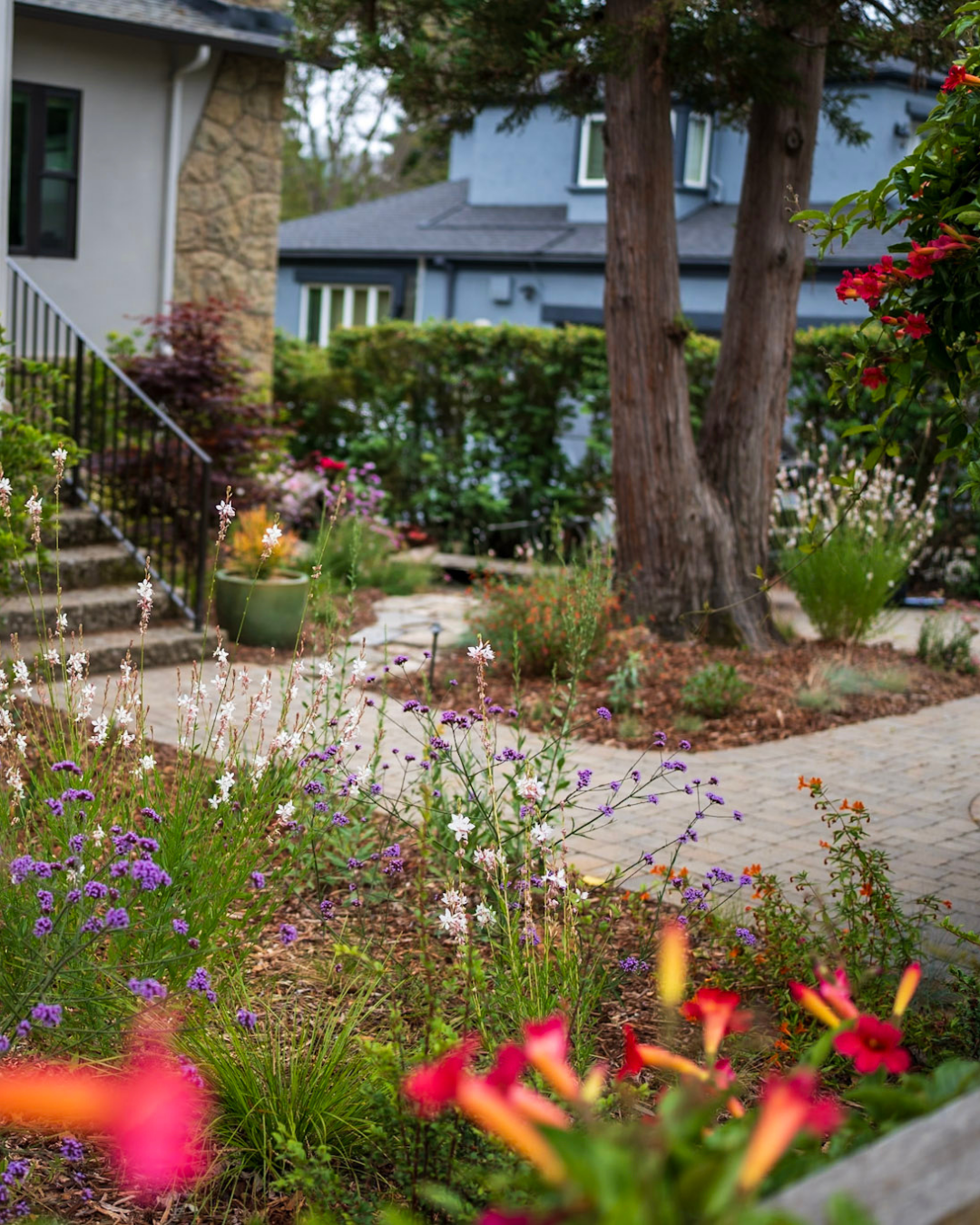 A once-flat, unused section of lawn was transformed into a recessed rain garden that captures runoff from the roof and hardscapes. Seating areas, pathways, and a vibrant pollinator garden invite the homeowners to enjoy the space daily, whether watching birds and butterflies or taking in the misty hillside views.